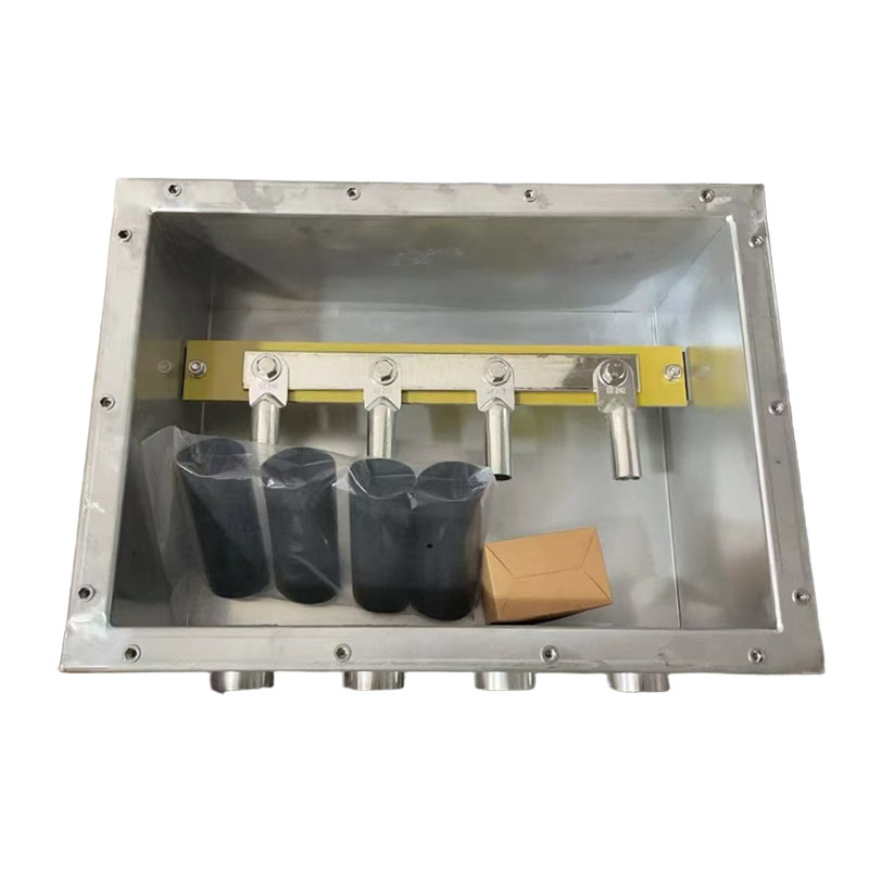 3)将箱体内接线端子拆下来,然后把剥切好的接地电缆和接线端子压接好,再将接线端子穿进箱体进线口,用螺丝固定好接线端子。
